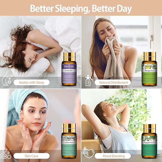 - --【Premium Quality Essential Oils】: PHATOIL essential oils are highly concentrated liquid derived from plants' flowers, leaves or other parts, which will provide you with a pure and pleasant aroma. The scents of essential oils are extremely rich, complex and long lasting. Each bottle is sealed and packaged individually so there is no risk of bottles leaking.