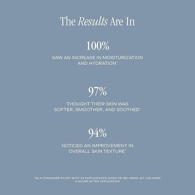 - The Results Are In - In a consumer study with 33 participants aged 25-55, 100% of participants saw an increase in moisturization and hydration 8 hours after application of Jet Lag Mask.*