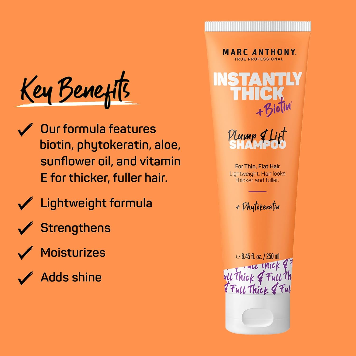 - Strength and Volume: Marc Anthony's Instantly Thick + Biotin collection not only delivers fuller body and shine but helps boost strength to invigorate thickness one strand at a time. The inclusion of Biotin in this targeted formula increases the volume impact even with fine and dry hair. See the difference, instantly.