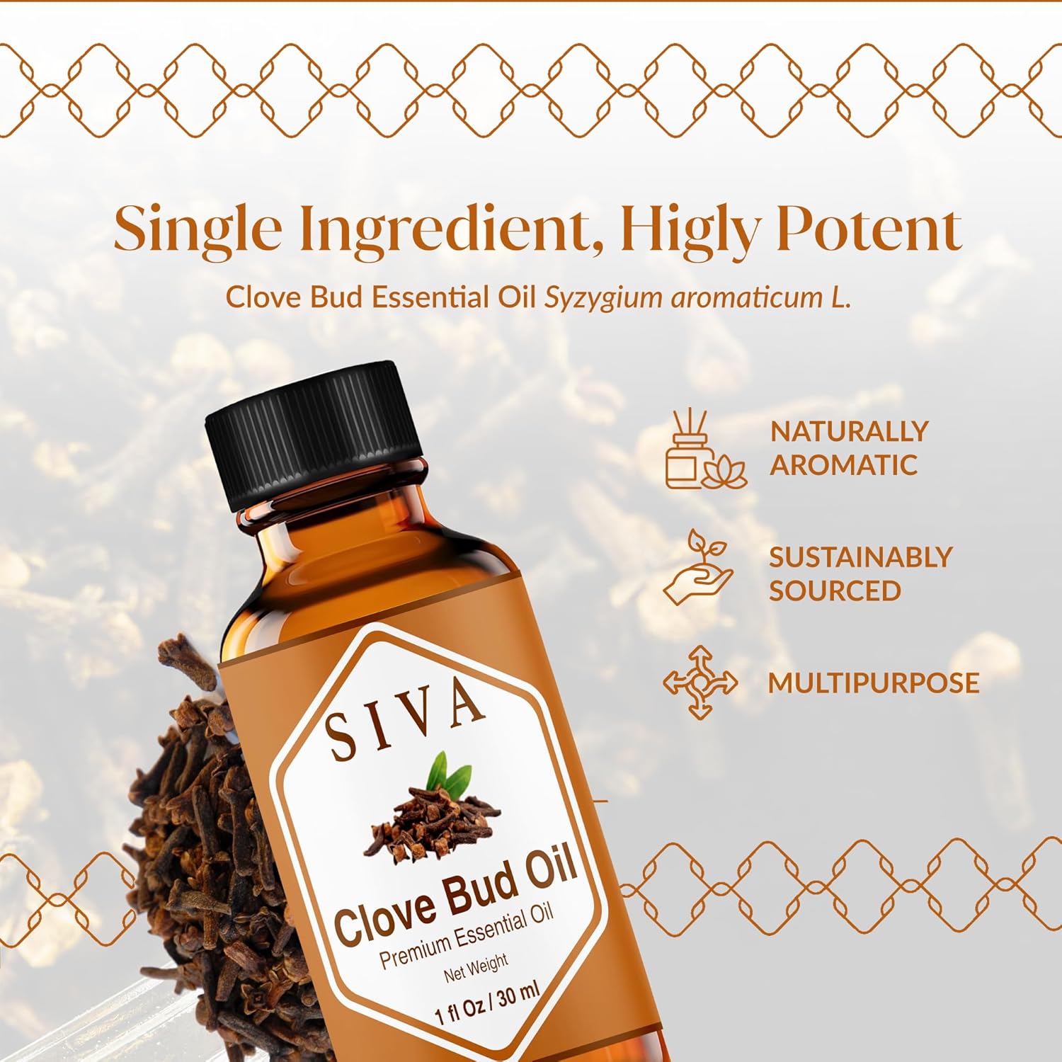 - Premium Quality Clove Bud Essential Oil: SIVA Clove Bud Oil 1oz is an essential oil and is obtained by steam distillation of Syzygium aromaticum L. buds. Our Clove Bud oil is free of preservatives and comes with a dropper for easy application. It is not tested on Animals. We care for you