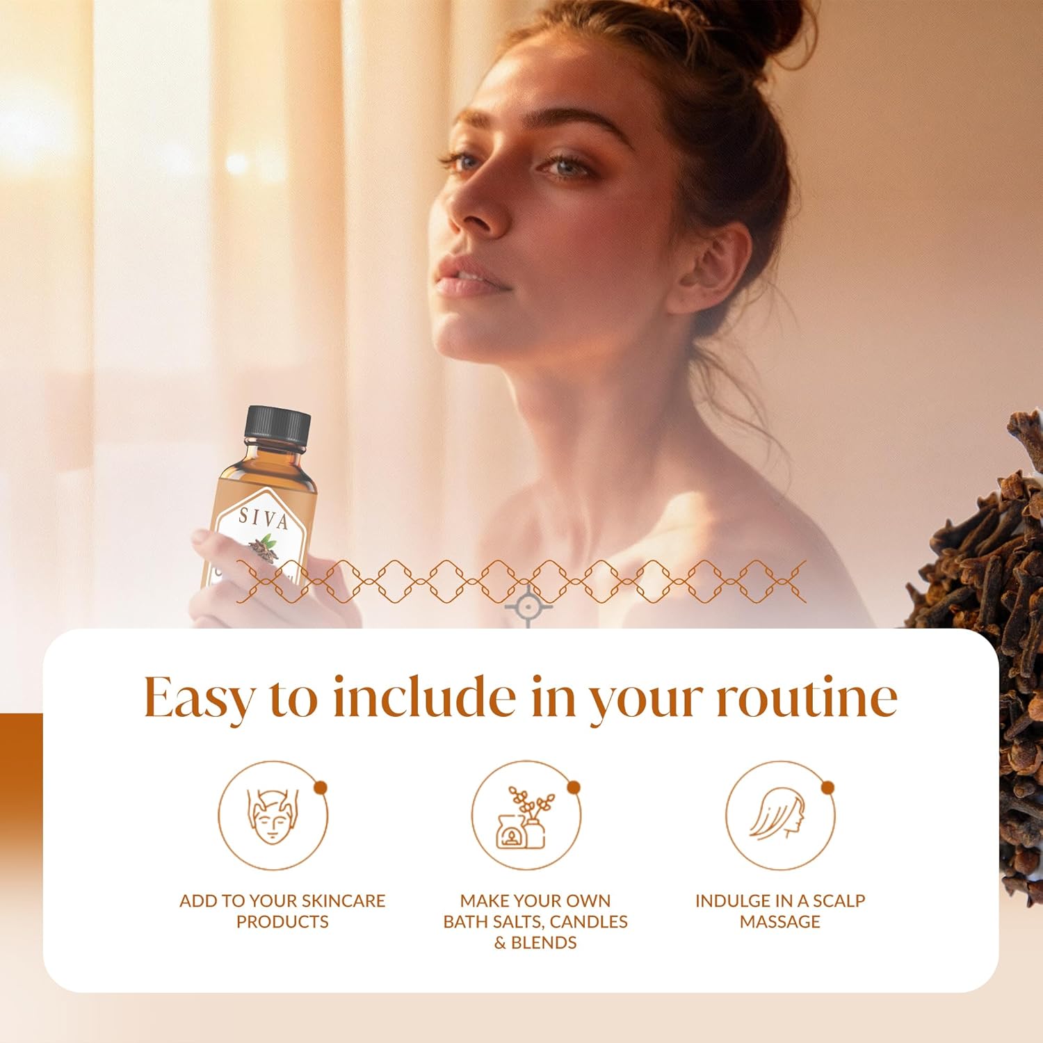 - Hair Care: SIVA Clove Bud Oil is widely used for hair and scalp massage. Always dilute with carrier oil before use since it is highly concentrated. To use Clove Bud oil for the scalp and hair, simply mix a few drops of the oil with a suitable carrier oil for massage. You can also use it by mixing a few drops of Clove Bud essential oil with a shampoo, conditioner, or hair mask of your choice