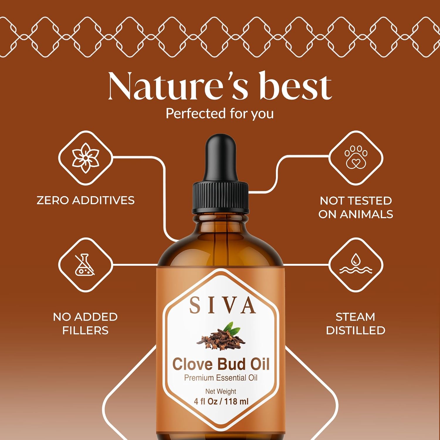 - Premium Quality Clove Bud Essential Oil: SIVA Clove Bud Oil is an essential oil and is obtained by steam distillation of Syzygium aromaticum L. buds. Our Clove Bud oil is free of preservatives and comes with a dropper for easy application. It is not tested on Animals. We care for you