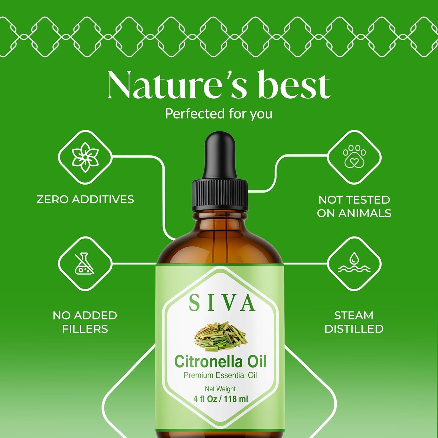 - Premium Quality Citronella Essential Oil: SIVA Citronella Oil 4oz is an essential oil and is obtained by steam distillation of Cymbopogon winterianus. SIVA Citronella oil is free of preservatives and comes with a dropper for easy application. It is not tested on Animals. We care for you!