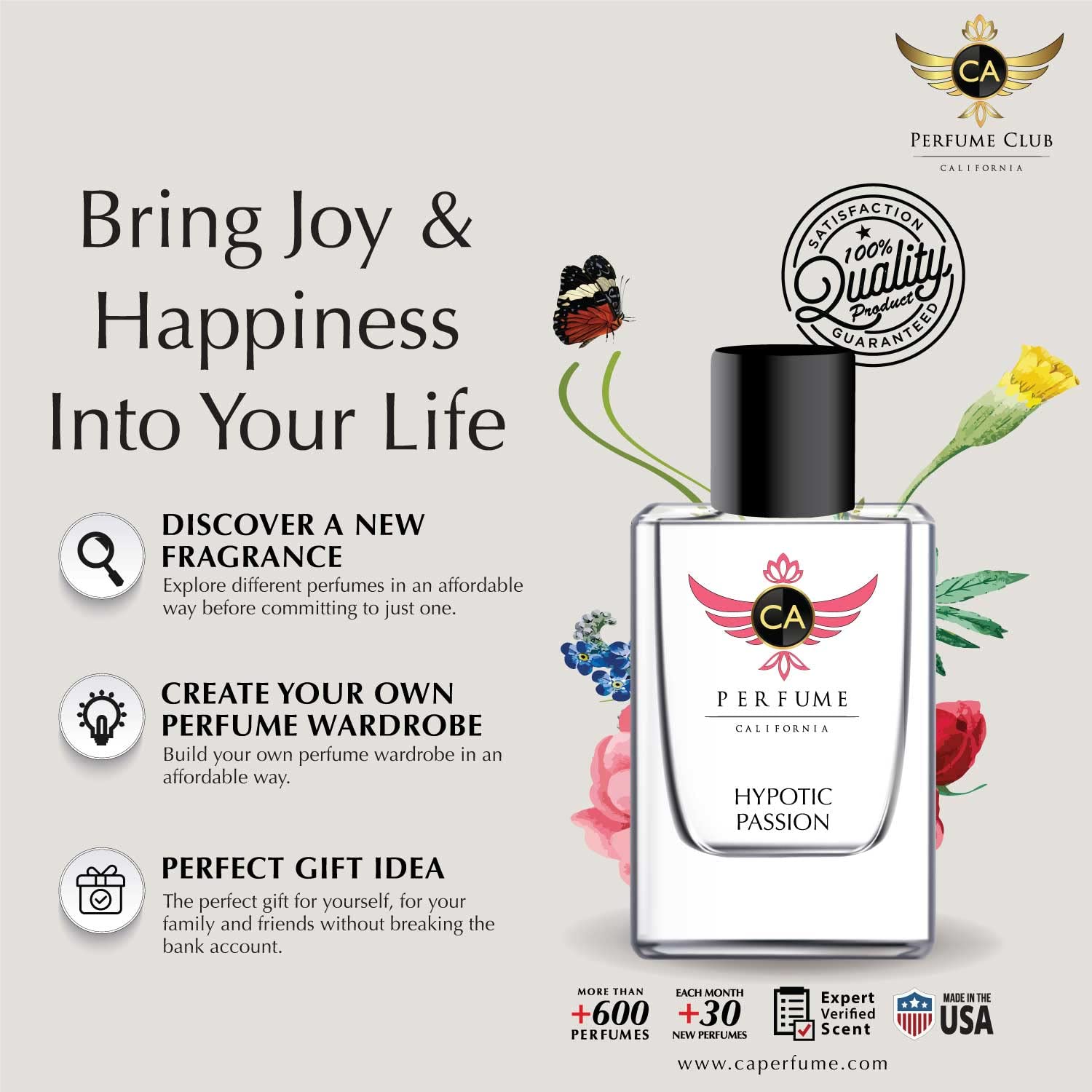 - [ Made In The USA Quality ] Our Premium Grade Perfume is highly concentrated and expertly developed by one of our master perfumers right here in the USA. CA Perfume offers a smart and cost-effective way to try and discover your next best perfume. We offer +1000 premium quality perfume ranges with +30 new perfume types added regularly every month to meet every expectation and carry only top-quality fragrances that have the same perfume quality and longevity as the expensive designer brand.