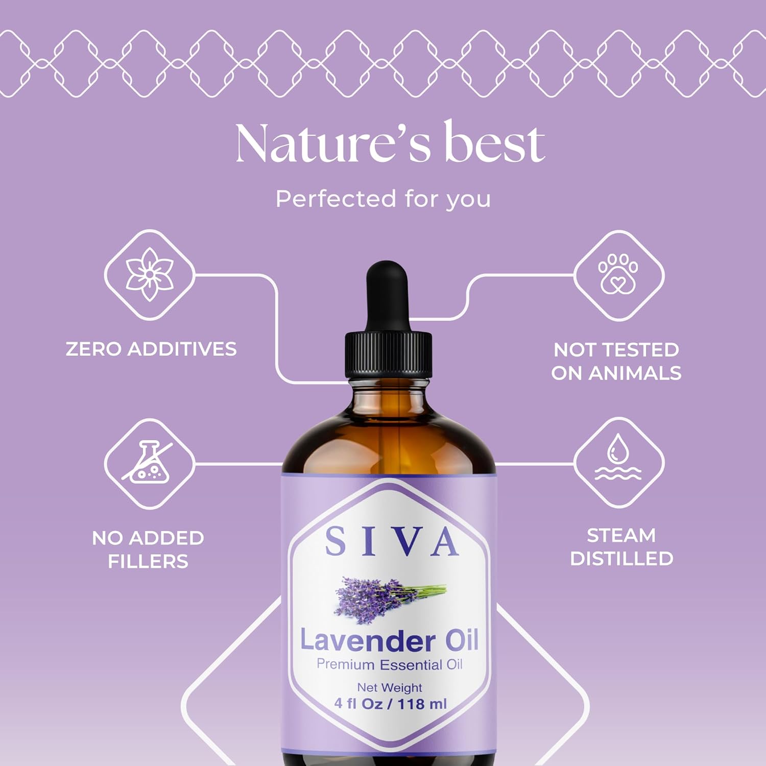- PREMIUM QUALITY LAVENDER ESSENTIAL OIL: SIVA Lavender Oil 4oz is an essential oil and is obtained by steam distillation of Lavandula Angustifolia flowers. Our Lavender essential oil is free of preservatives and comes with a dropper for easy application. It is not tested on Animals. We care for you!