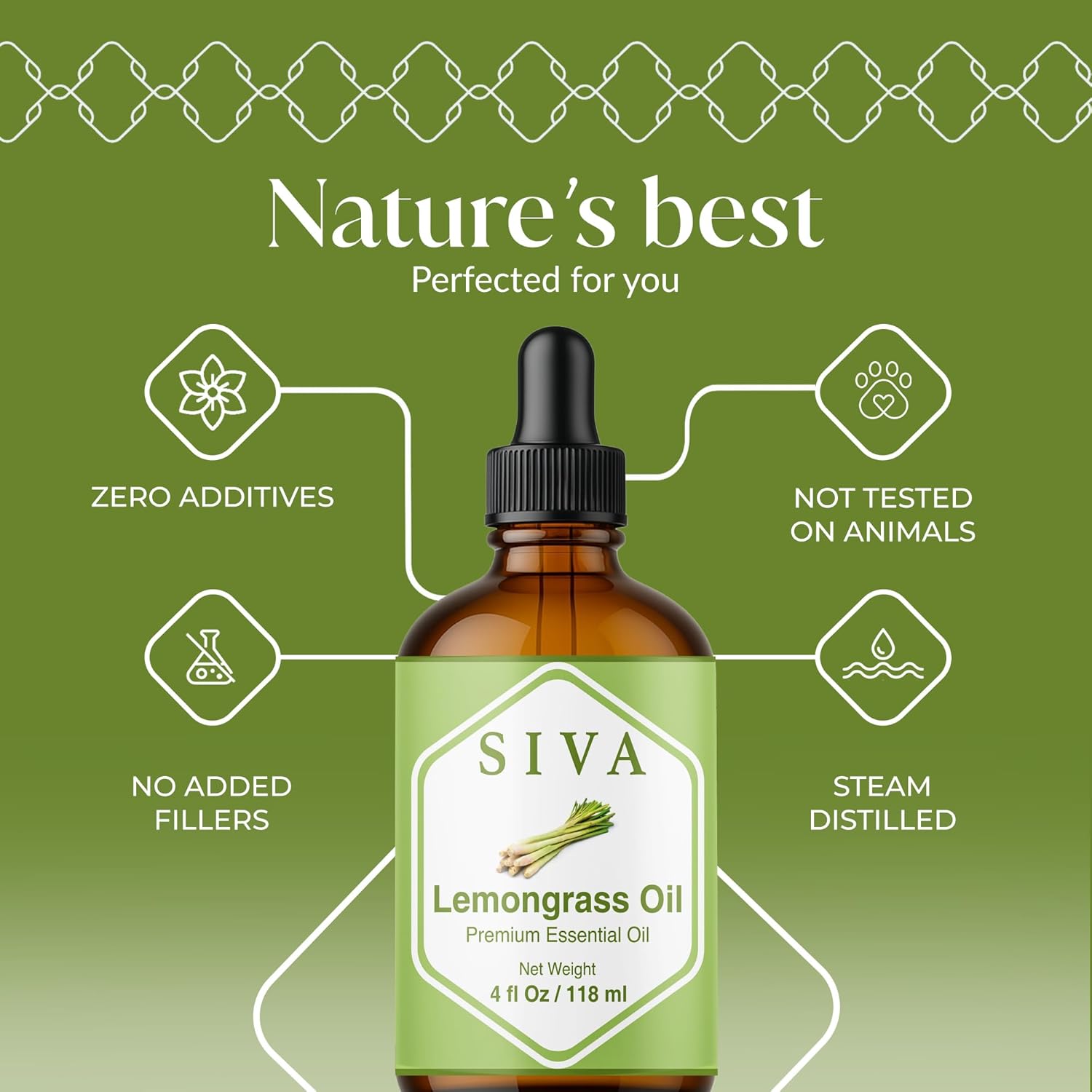 - PREMIUM QUALITY LEMONGRASS ESSENTIAL OIL: SIVA Lemongrass Oil is an essential oil and is obtained by steam distillation of Cymbopogon flexuosus leaves. Our Lemongrass oil is free of preservatives and comes with a dropper for easy application. It is not tested on Animals. We care for you!