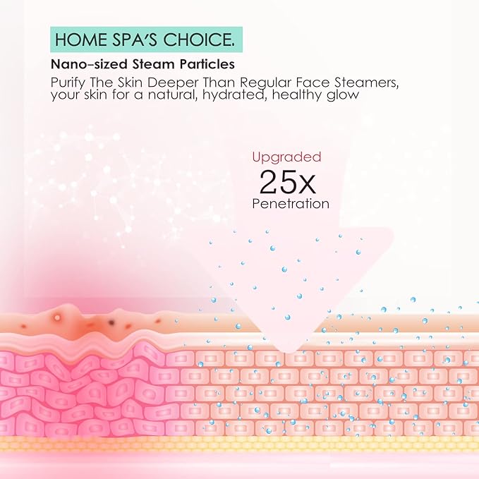 - Nano Ionic Steam: Nano-ionic facial steamer effectively converts pure water into nanoscale water molecules, which can more easier hydrate the skin. The clean, fine mist provides your skin with the moisture it needs to keep it naturally plump and hydrated, up to 20x more effective in penetrating skin.