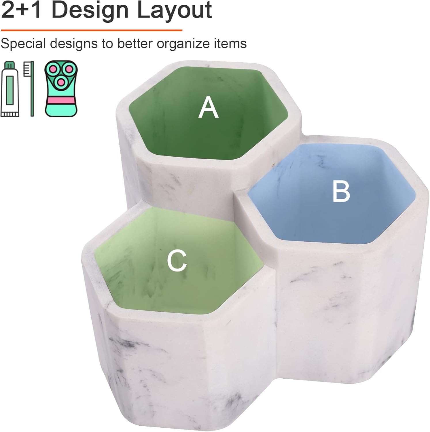 - PRACTICAL & STYLISH: The toothbrush holder measures 6" x 6" x 5". Our toothbrush and toothpaste holder features a 3-slot design. The middle slot can hold small items like electric toothbrushes, while the larger compartments on either side can store toothpaste and razors. It perfectly meets the family's needs for storing toothbrushes, makeup brushes, and stationery. With a stylish marble pattern, our toothbrush holder is not only practical but also adds a decorative touch to your countertop