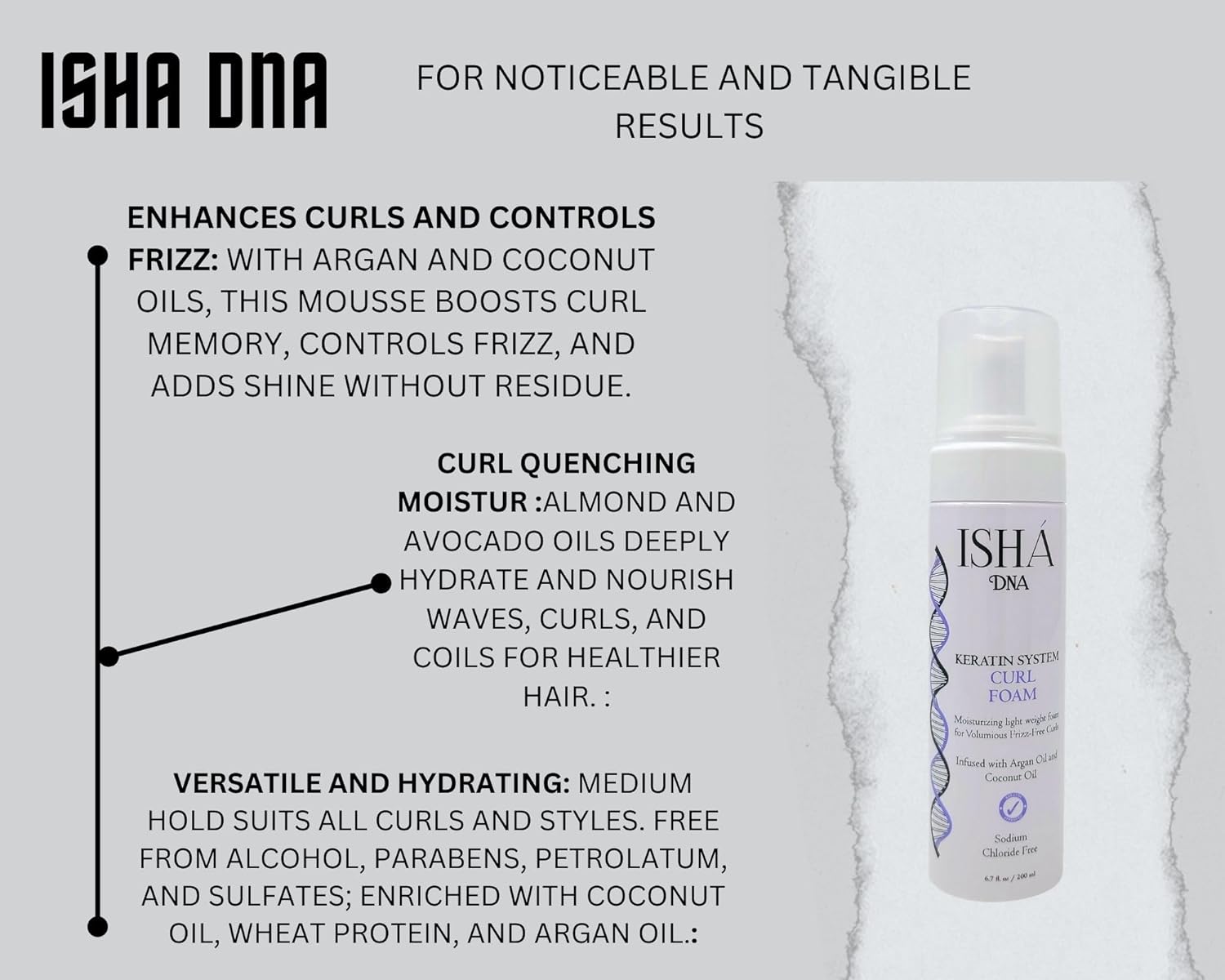- ISHA DNA Curly Hair Mousse Enhances Natural Curl Memory And Wave Pattern. Infused With Argan Oil And Coconut Oil Helps Control Frizz And Nourishes The Hair. It Creates Shinny Curls With Volume Without Leaving Residues