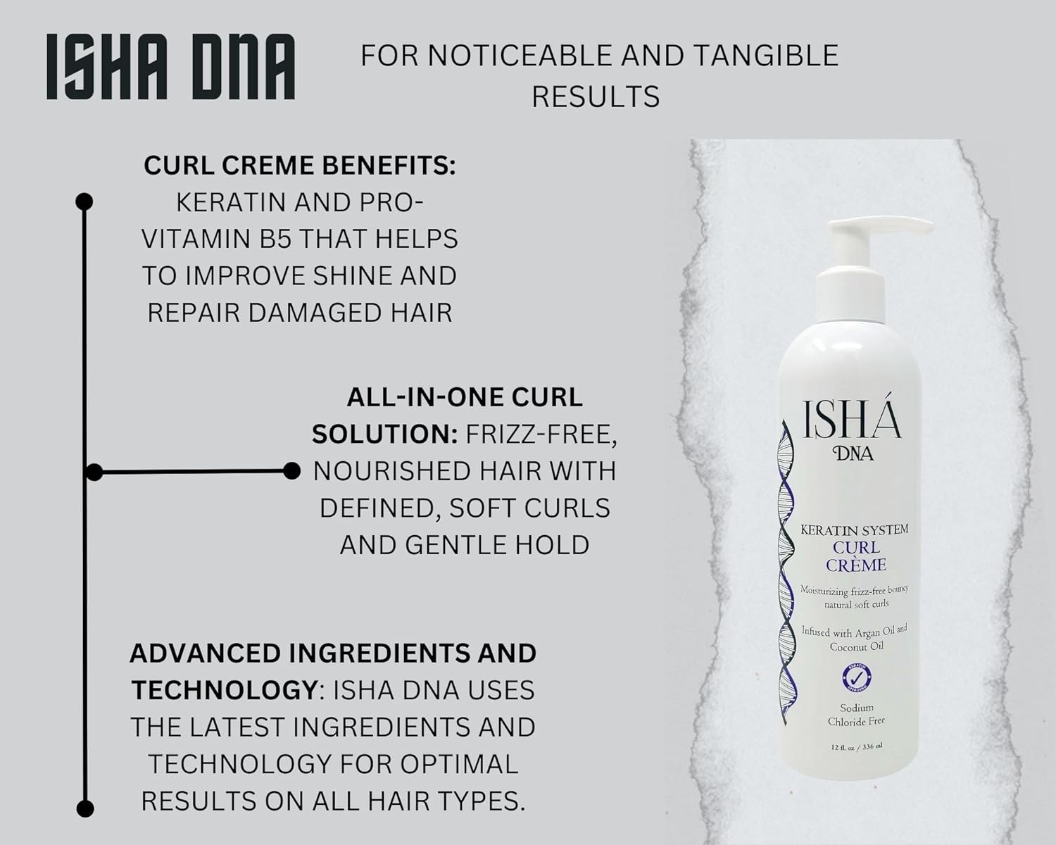 - ISHA DNA Keratin System Curl Creme Creates Frizz Free Soft Curls While Nourishing Your Hair With This Argan And Coconut Oil Enriched Baml. Contains Keratin And Pro-vitamin B5 That Helps To Improve shine And Repair Damaged Hair
