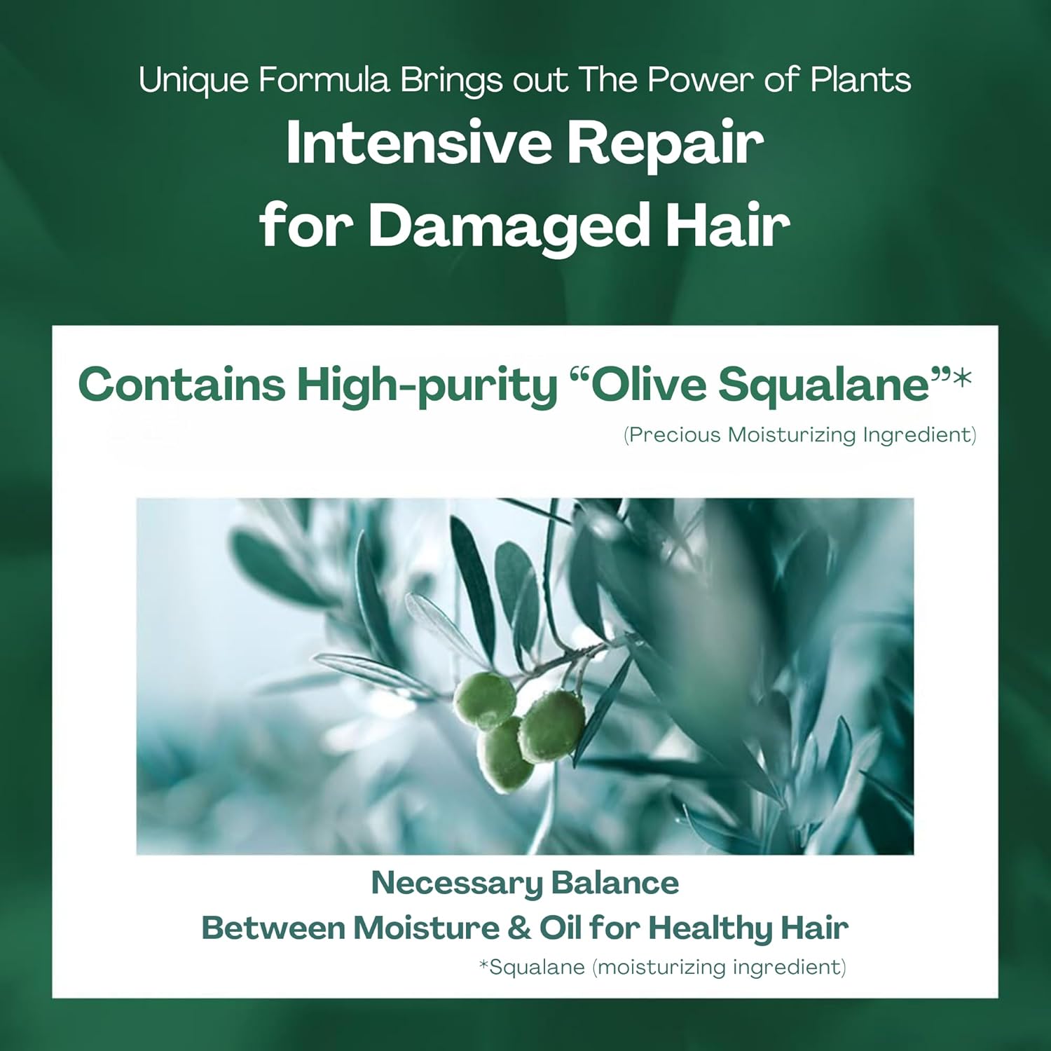 - 【Olive Squalane for Intensive Repair Damaged Hair】High-purity olive squalane in the formula offers intensive repair for severely damaged hair. It strengthens the hair’s structure, improves elasticity, and protects against further damage, leaving your hair stronger and more resilient over time.