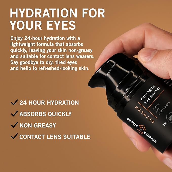 stubble & stache Refresh Under Eye Cream for Men – Reduces Puffiness, Smooths Fine Lines, Brightens Tired Eyes – With Acmella, Caffeine & Hyaluronic Acid – Fast-Absorbing, Fragrance-Free – 1oz
