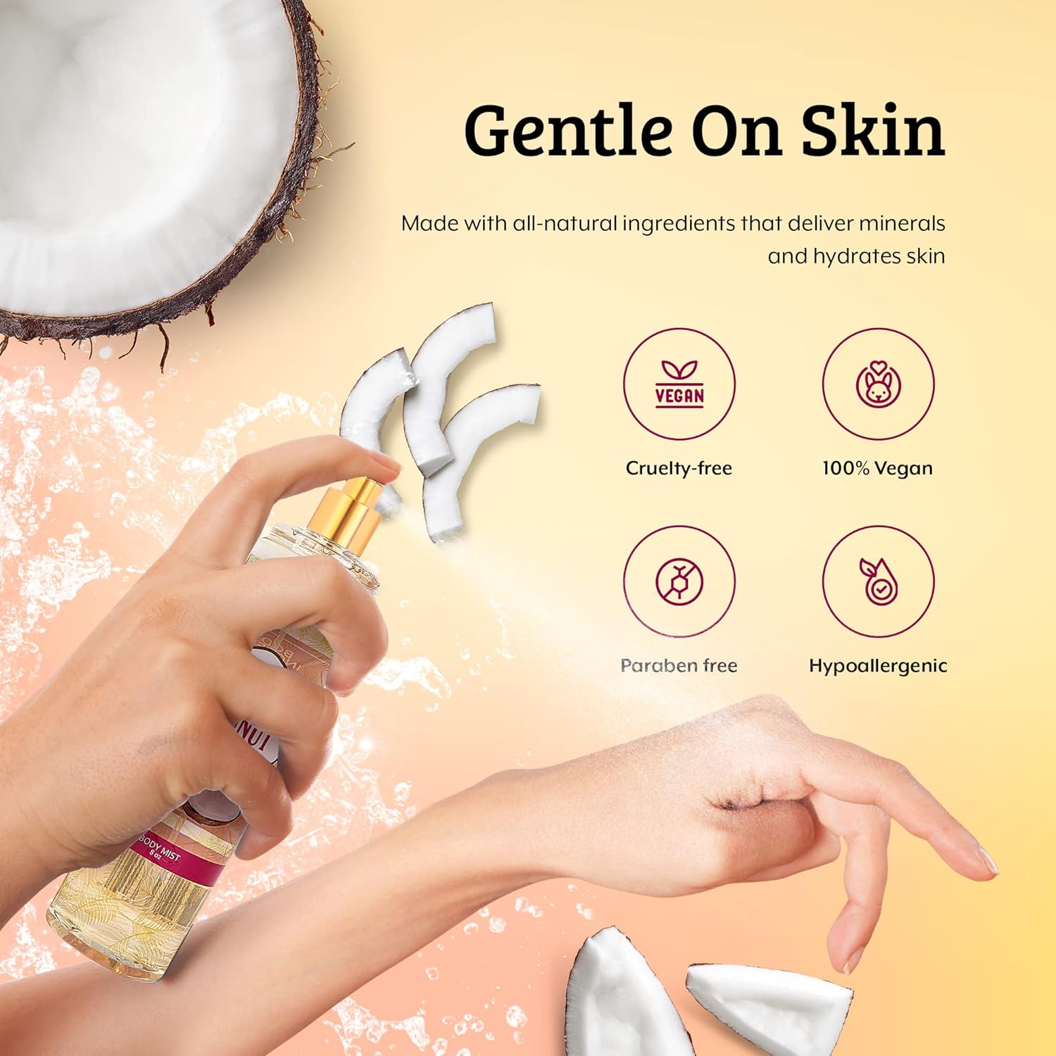 - Elevate Your Senses: Our Coconut Body Spray for Women is a captivating blend of warm and cozy fragrances, designed to envelop you in pure luxury. Indulge in the essence of Coconut, a scent that evokes tropical paradise and relaxation.