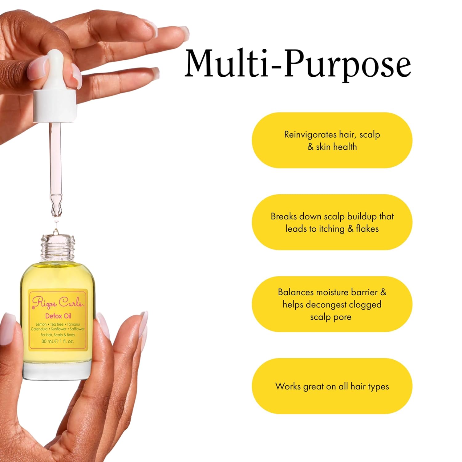 - BENEFITS: Reinvigorates hair, scalp & skin health. Lightweight oil treatment that detoxes and purifies and balances scalp & skin.