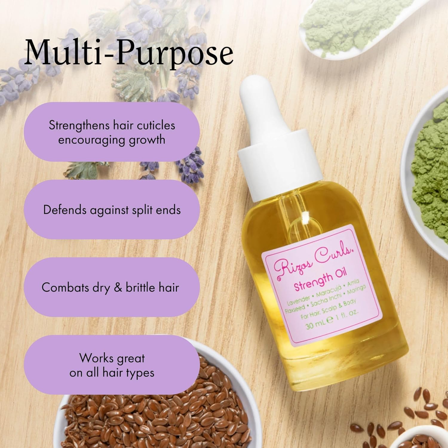 - FLAXSEED Oil: Nutrient-rich & fortifying, helps reinforce hair strength, thickness & encourages length retention. Help protect from damage & dryness.