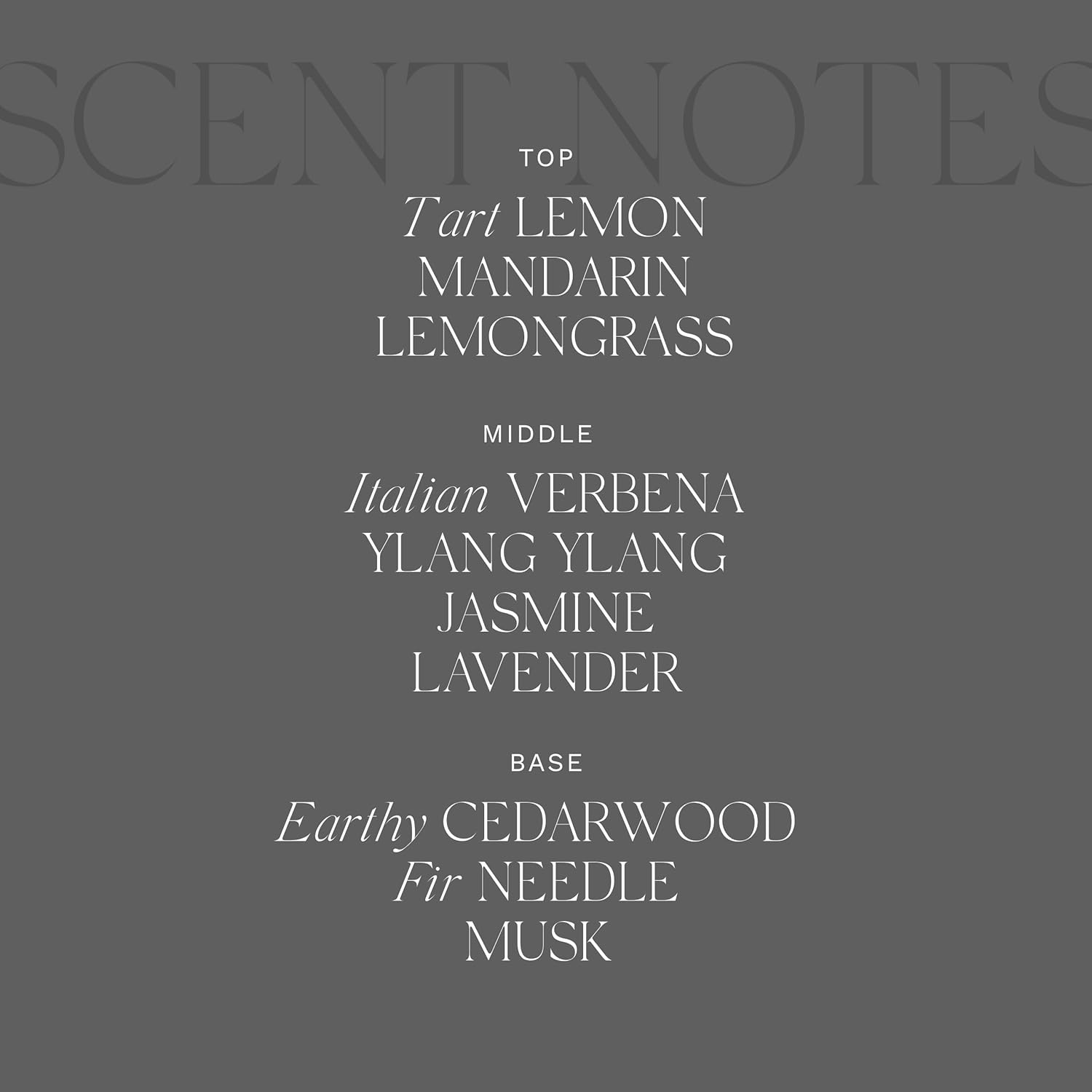- Timeless Citrus: Our scent is an invigorating blend of citrus; infused with Italian verbena and jasmine, this fragrance has a base of cedarwood, fir needle and warm musk for a balanced sensory experience