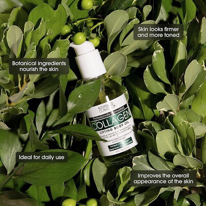 - COLLAGEN BODY OIL WITH VITAMIN E, BOTANICALS, & VITAMIN C - Hydrates and nourishes while helping to visibly firm and smooth the look of skin. This antioxidant-rich blend supports a more even-looking tone and enhances skin’s softness and radiance. This luxurious yet lightweight body oil glides over skin to help lock in moisture and visibly smooth texture. Ideal for anyone who is looking to enhance their skincare beauty routine.
