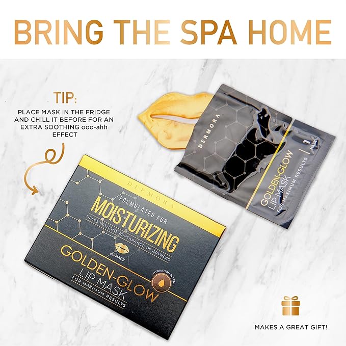 DERMORA Skin Treatment Mask Golden Glow Lip Mask - 20 Pack Lip Gel Masks - Rejuvenating Lip Masks for Lines, Wrinkles, Tightening, Firming