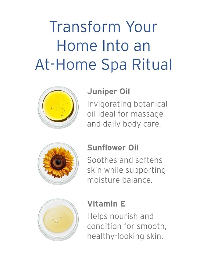 - RELAXING BODY OIL. Unwind from a long day with stimulating Juniper Essential Oil. Pure essential oils combined with Vitamin E and sunflower oil provides a sense of balance and tranquility while moisturizing and nourishing the skin.