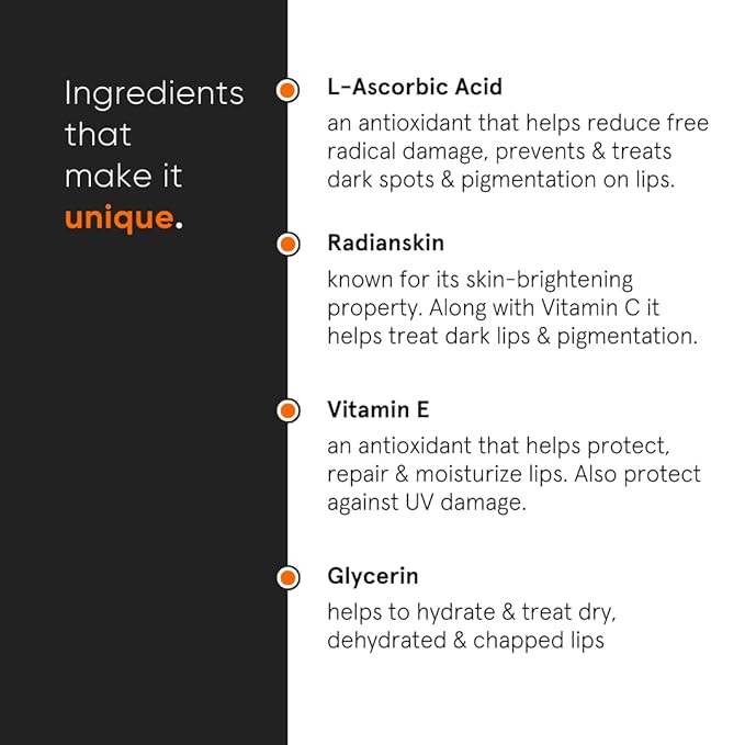 - A new effective inhibiter of melanin called Radianskin is used in formulation to reduce spots and coloration on lips