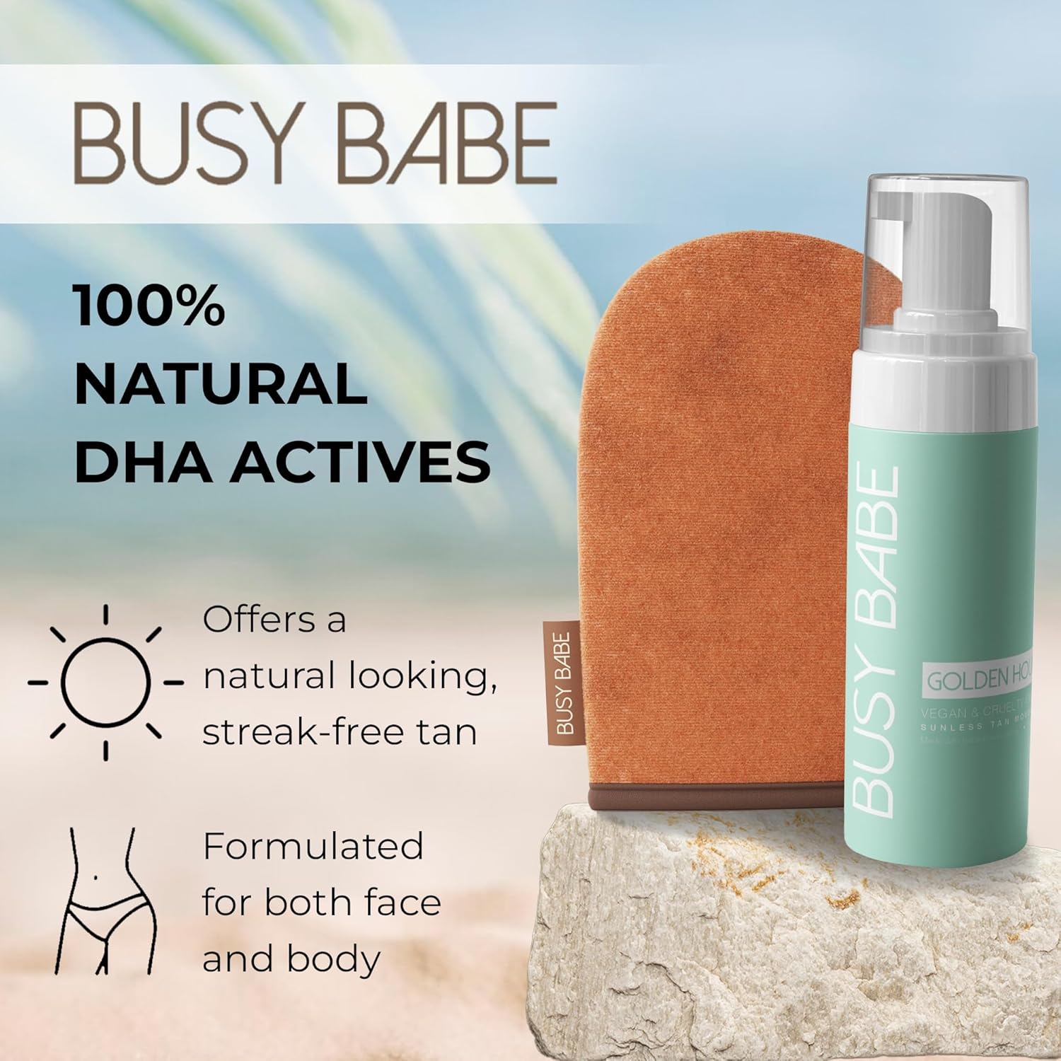 - SEAMLESS APPLICATION: Experience a hassle-free application process with Busy Babe Golden Hour Rapid Bronze sunless tanner. Our included mitt ensures a smooth, streak-free finish every time, so you can flaunt your luminous radiance with confidence. Made with a unique blend of ingredients, our foam tanning mousse ensures faultless results, leaving you with a flawless tan that lasts. Say goodbye to streaks and hello to flawless radiance with Busy Babe.