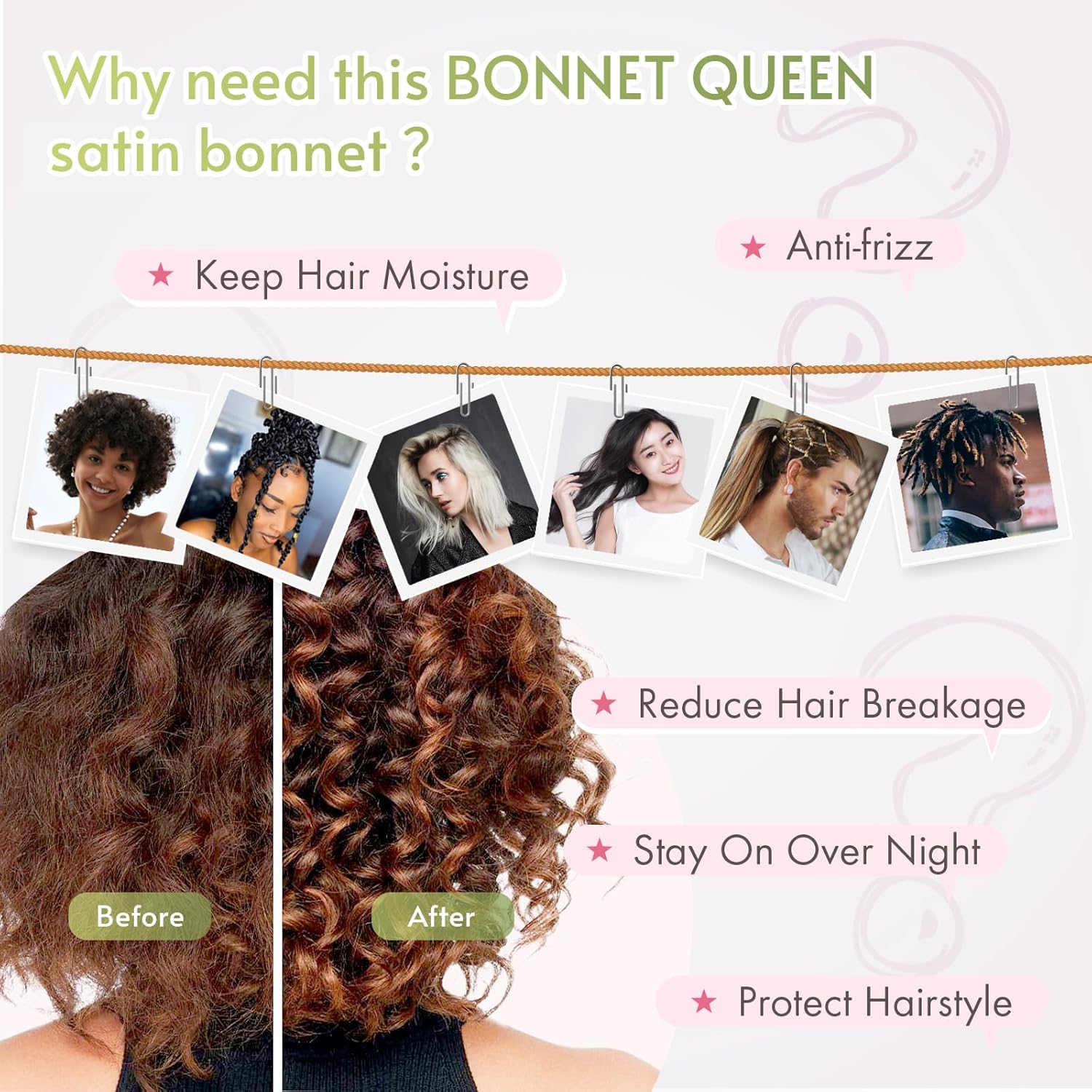 - Quality material: Bonnet part is made of good texture silky satin, which is breathable and smoothy, and can keep hair moisture too. Long band is made of stretchy spandex material, comparing common elastic band Bonnet, this Bonnet wouldnot make you feel tight and leave imprint on head, and much more cosy.