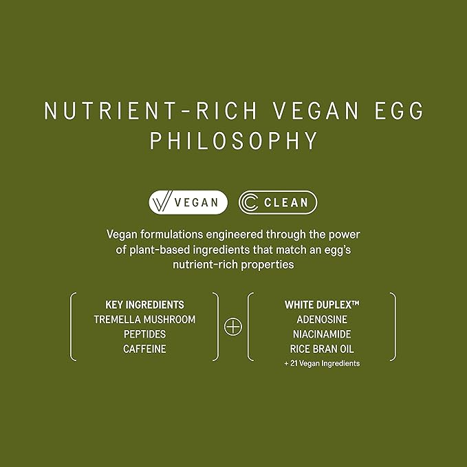 - WHITE DUPLEX (Egg White Duplicated Complex) – Engineered through innovative technology to duplicate vital egg white nutrients with 21 high-grade vegan ingredients. Our proprietary blend includes Tremella Mushroom, Adenosine, Niacinamide, Amino Acids, and Minerals to firm, lift, and balance the skin.