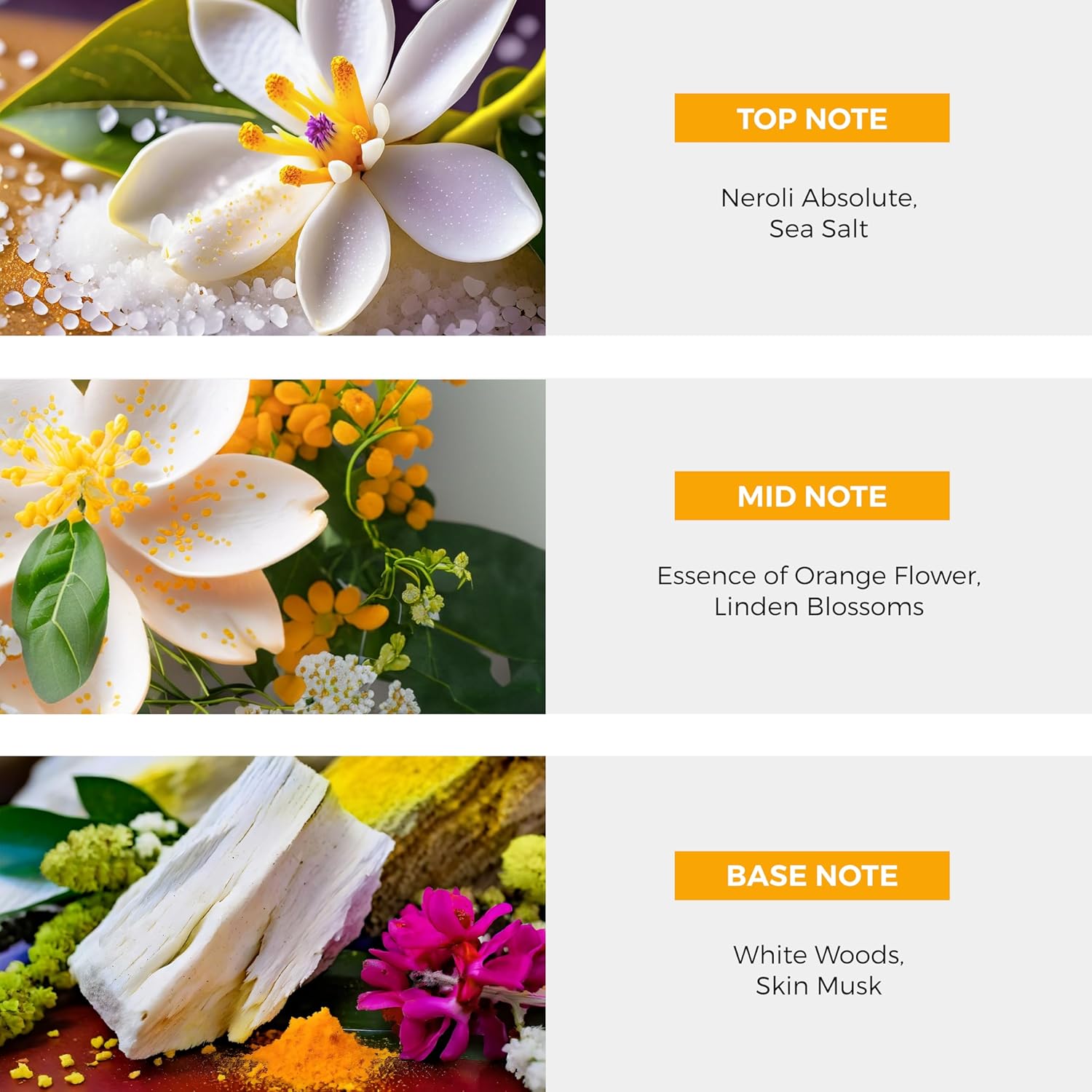 - KEY NOTES: Enjoy the delightful combination of Neroli Absolute, Sea Salt, Essence of Orange Flower, Linden Blossoms, White Woods, and Skin Musk.