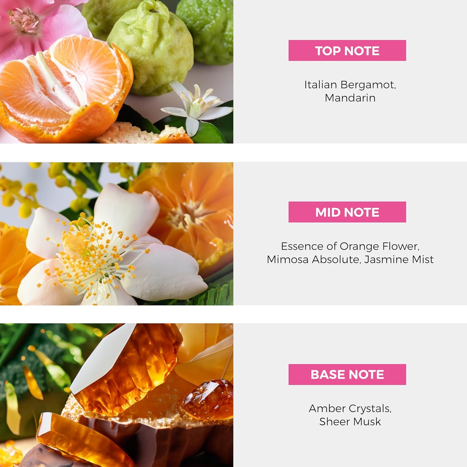 - KEY NOTES DELIGHT: Embark on a sensory journey with key notes of Italian Bergamot, Mandarin Essence of Orange Flower, Mimosa Absolute, Jasmine Mist, Amber Crystals, and Sheer Musk.