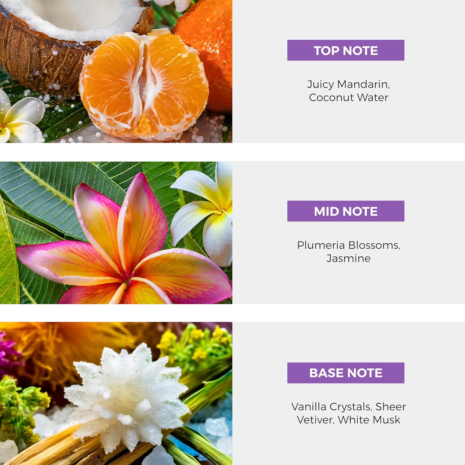 - KEY NOTES JOURNEY: Embark on a sensory journey with key notes of Juicy Mandarin, Coconut Water, Plumeria Blossoms, Jasmine, Vanilla Crystals, Sheer Vetiver, and White Musk.