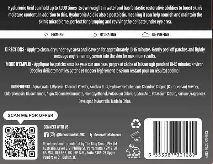 - Revitalize Your Eyes - Generation Skin’s eye patches are packed with moisture-boosting hyaluronic acid, ensuring your delicate under-eye area stays hydrated and radiant all day long.