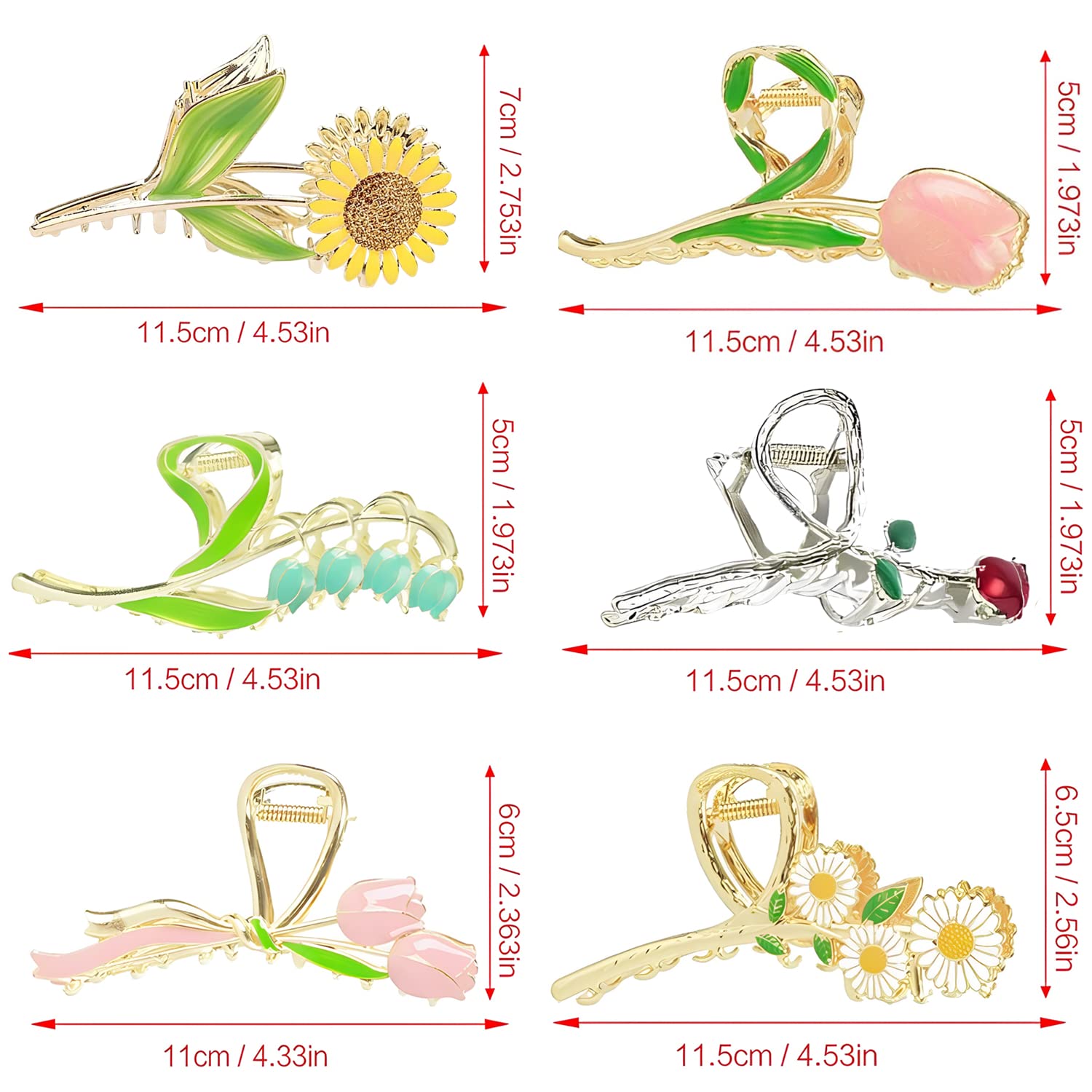 - 【Original Cute and Vivid Flower Design】-- Inspired by roses, Bell orchid, lilies, sunflowers and tulips, lively and sophisticated with luxurious gold, add your hair with elegance and delicacy. 6 different shapes and colors are able to meet all your daily outfits, avoiding you getting bored with the hair claw clips, offering you more choices and fantastic mood every day!