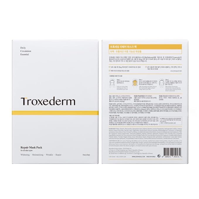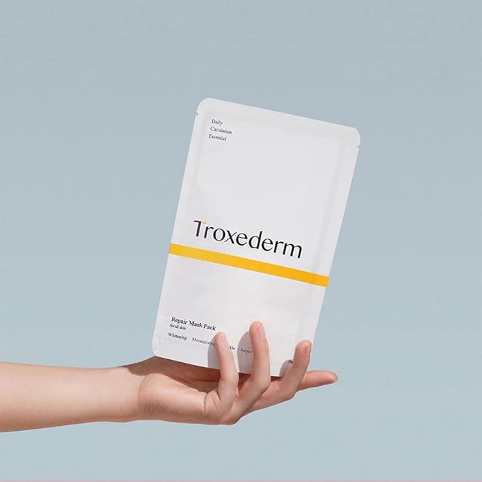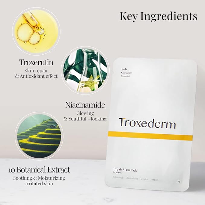 - [ENHANCE SKIN TONE WITH JUST ONE USE] - Experience a more even and radiant skin tone with just one use of our Troxederm Repair Facial Mask. Infused with a blend of powerful ingredients, including Troxerutin, 10 natural extracts, Adenosine, and Niacinamide, this mask works to improve skin tone and leave you with a healthy glow.