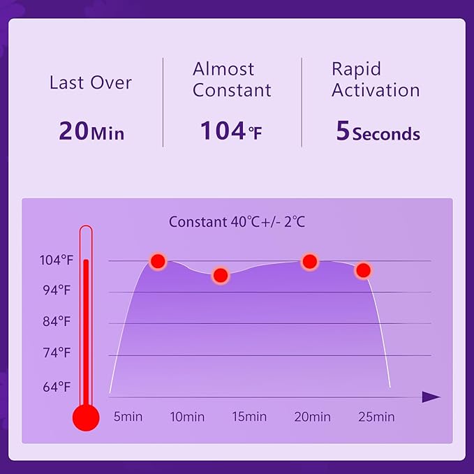 - Patented & Stable -- The eye soother masks gain patented ultra thin self-heating cell, last for about 25minutes with constant temperature of 40℃(104F), as well as gentle but dense steam. Warm and wet vapor helps better rejuvenate tired eyes, improve micro-circulation around your eyes, and promote absorption of eye creams, allowing you to enjoy face spa anytime and anywhere