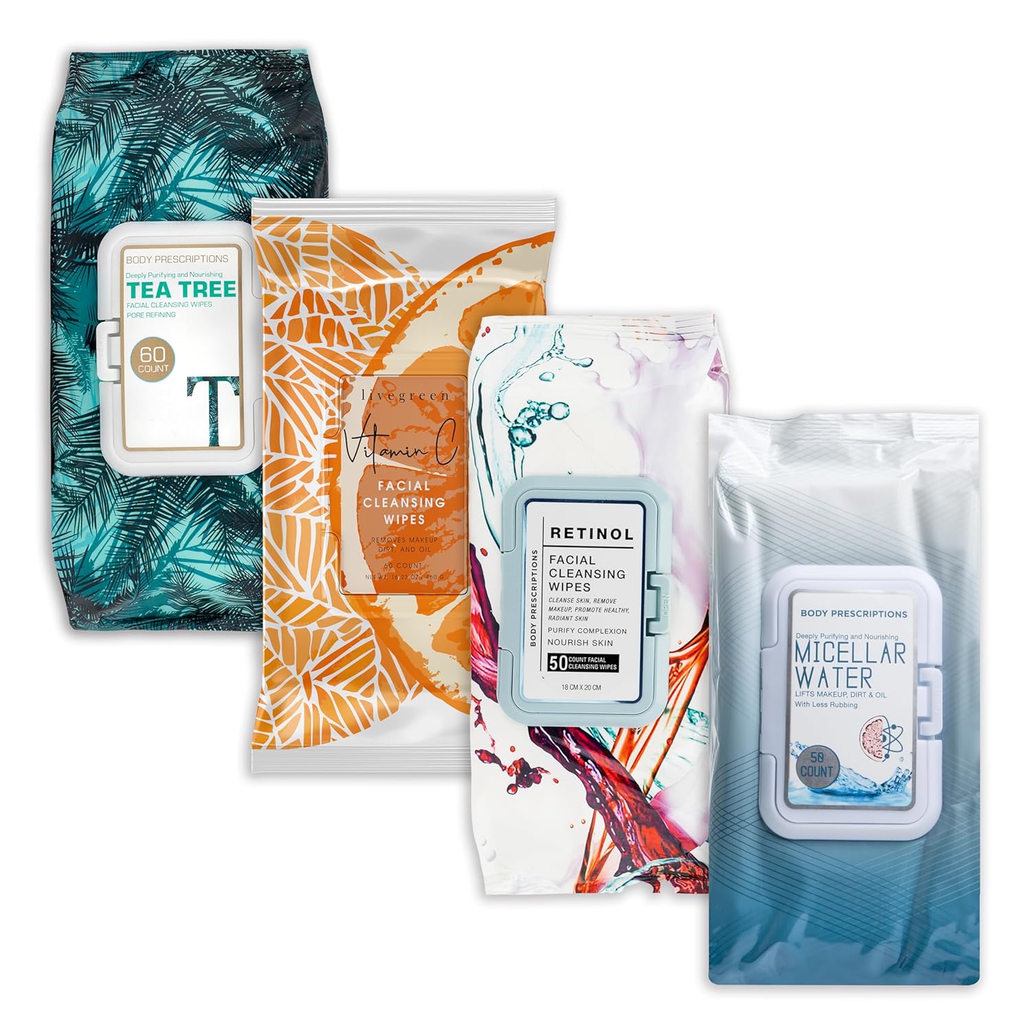 Body Prescription Makeup Cleansing Wipes - Gentle and Effective Face Wipes, 50 Count (Pack of 4), Tea Tree, Retinol, Micellar Water, and Vitamin C