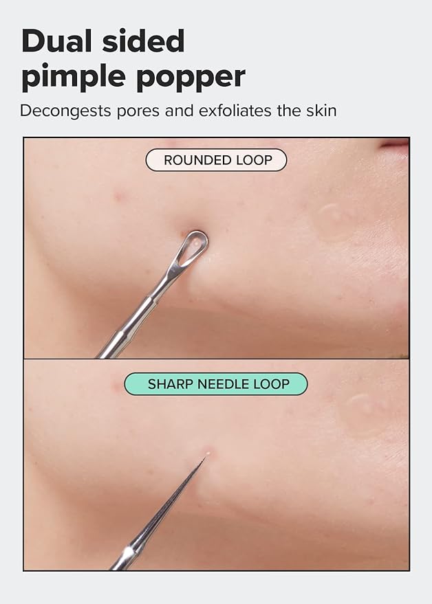 - DUAL SIDED: This dual-tip tool helps remove blackheads, whiteheads and blemishes with a gentle touch. Sharp needle tip for opening pores, and loop shaped end for cleaning up blackheads, whiteheads, and blemishes.
