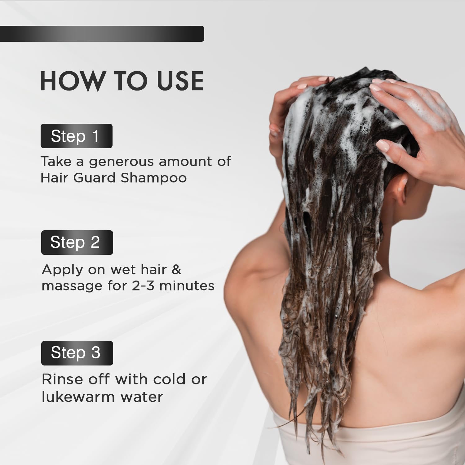 - ✔️ HOW TO USE HAIR GUARD SHAMPOO — The sulfate-free shampoo is your go-to choice if hair fall haunts you. Take a generous amount of shampoo on your palm and apply it on wet hair. Lather it properly and cleanse it from scalp to end. Rinse thoroughly and follow up with Moehair Hair Guard Conditioner and Hair Guard Tonic. Say goodbye to hair loss, and flaunt your gorgeous hair