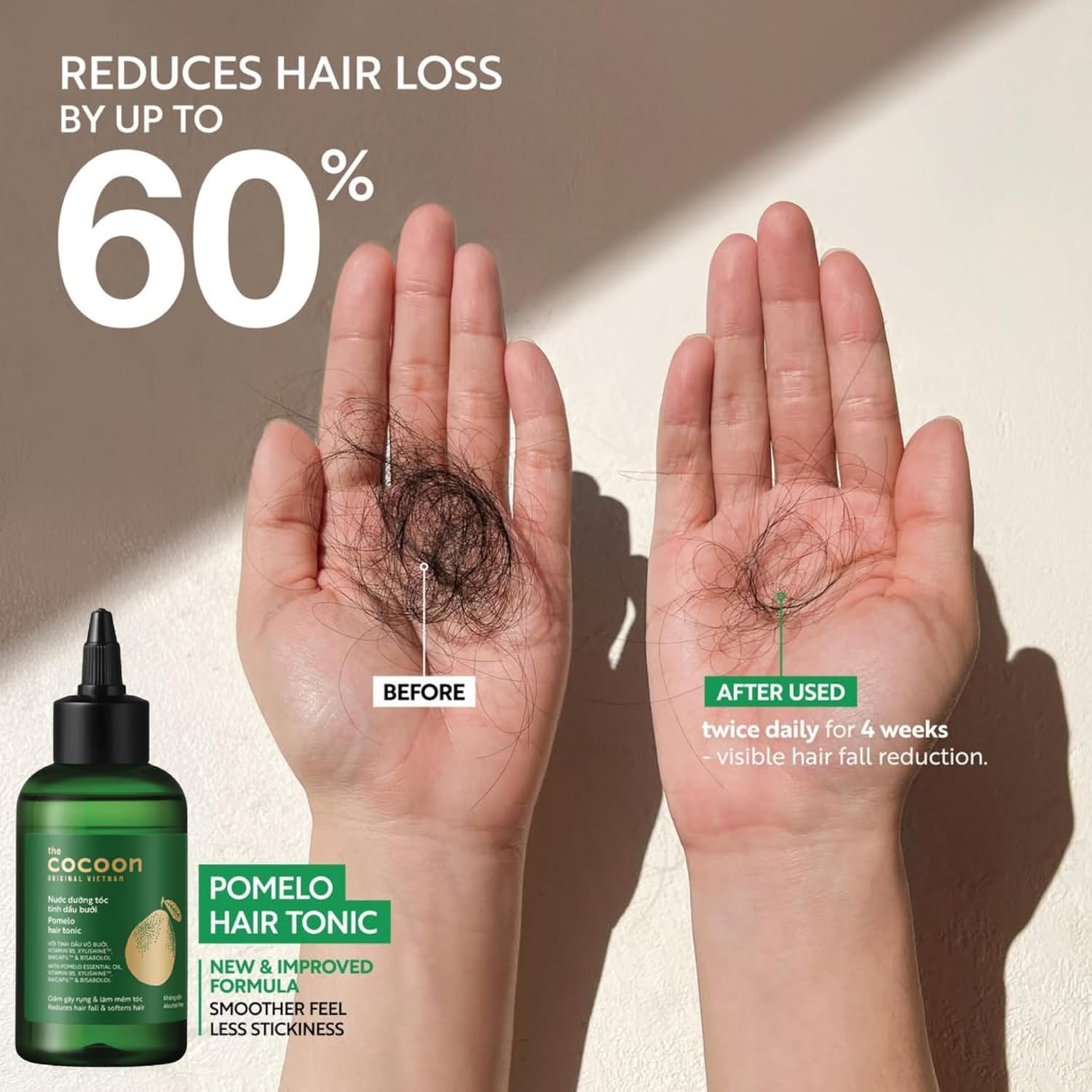 - REAL HAIR TRANSFORMATION - 100% vegan products are mild? Think again. This hair tonic just works. Customers and influencers alike are raving about Cocoon's incredible effects, with many calling it the "best hair care product ever" that "works miracles" and is a "holy grail of hair care." And it's suitable for all hair types. Whether you're struggling with split ends, breakage, or just hair that won't grow, our Pomelo Hair Tonic is the solution you've been searching for.