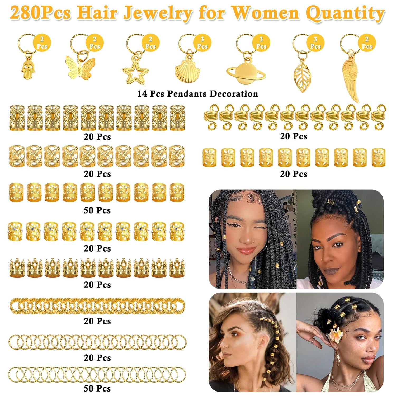 280 Pcs Hair Jewelry for Women, Hair Charms Cuffs Beads for Braids Loc Jewelry for Dreadlocks, Adjustable Gold Braids Coils Rings Decoration for Dreadlock Accessories