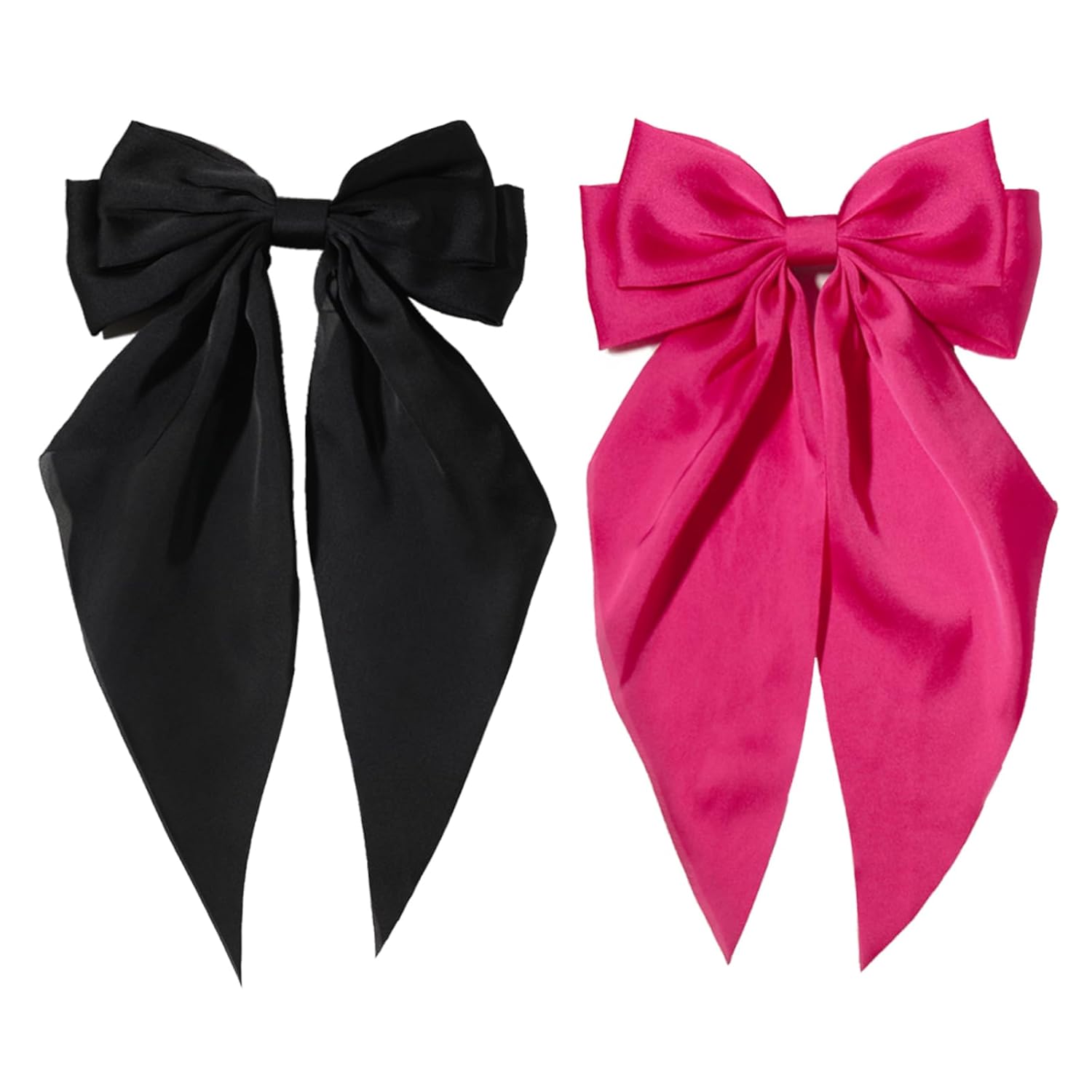Furling Pompoms Hair Bows Clips for Women Large Bow Clip for Girls Satin Long Tails with Alligator Clips 2pcs Big Hair Bow Hair Accessories (Black Hot Pink)