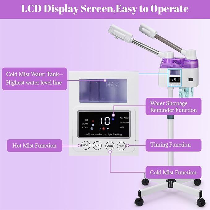 - 【Easy to Operate and Use】Digital LCD screen panel, easy to operate.This professional facial steamer can be used in beauty shops, hair salons, spas, and home, it is compact and convenient, and won't take up too much space.