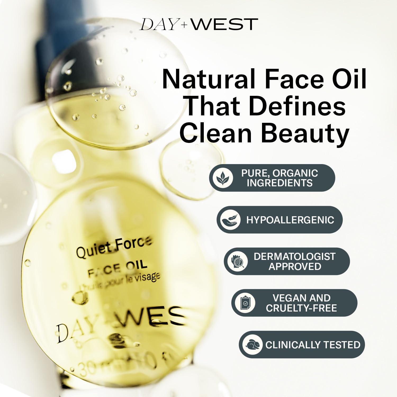 - HYDRATING AND VERSATILE SKINCARE SOLUTION: Get deeply hydrated, soft, and smooth skin with our expertly formulated face oil. Made with plant derived squalane and natural oils like jojoba, almond, and rosehip, Day+West Quiet Force Organic Face Oil offers intense moisture without a greasy feel. Great for the face, neck, elbows, and décolletage, this lightweight oil works as a facial moisturizer, hydrating treatment for dry skin, or a soothing addition to your gua sha routine.