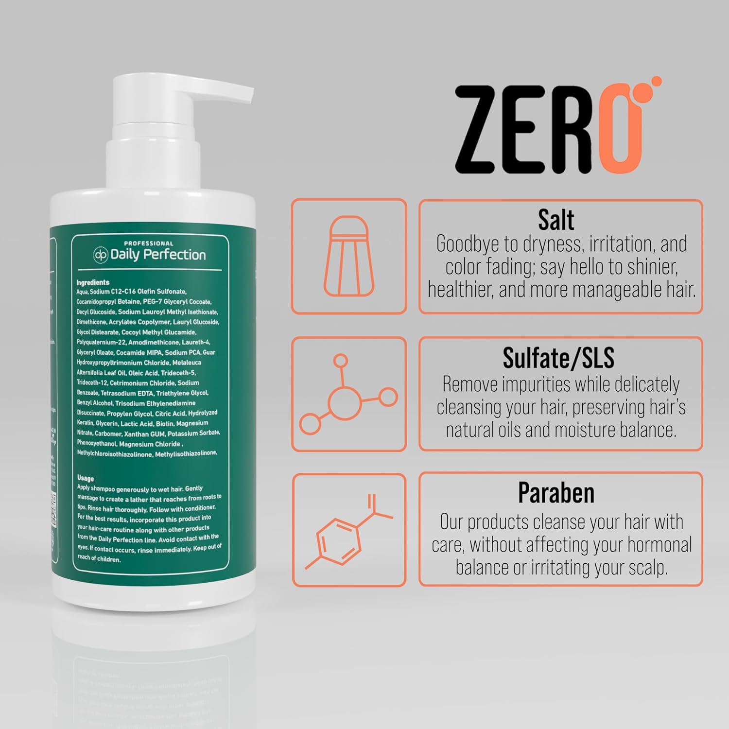 - Salt-Free, Sulfate-Free, Paraben-Free: Daily Perfection's formula is free from sulfates, parabens, and the harsh effects of salt. Our products offer a gentle cleanse that preserves your hair's natural oils.