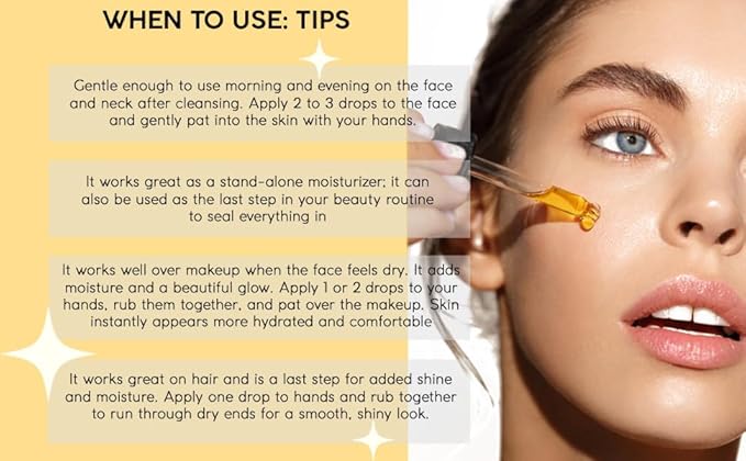 - It can also be used on the face, neck, body, nails, and hair. Superior moisturizers help balance skin. It comes in a glass dropper bottle. This oil is not greasy and completely sinks into the skin within a few minutes. It suits all skin types and is excellent for dehydrated and mature aging skin. It can be used at night or during the day under makeup.