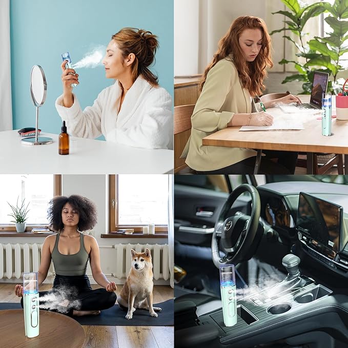 - 【 Wide Application & Multiple Charging Options】The facial care mister produces an ultra-fine nano-ionized mist. Slide the switch to dispense the mist in one second. The facial care steamers is perfect for moisturizing the face, body, hair, eyelash extensions, and daily makeup. The mini face mister can also relieve symptoms of allergic rhinitis and nasal congestion, and soothe tired eyes. You can charge the face mister anytime with powerbank, laptop, power outlet, or car charger.