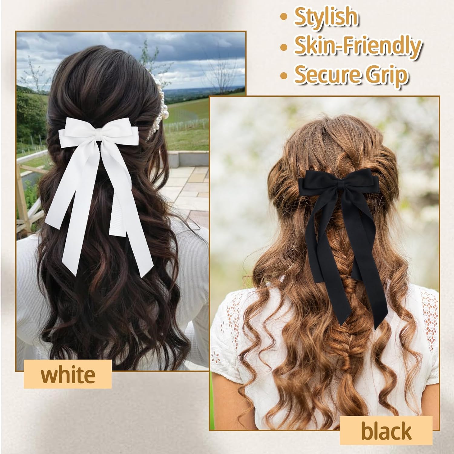 Bow Hair Clips 2PCS Set for Women and Girls - Black White Ribbon Bows for Hair, with Long Tail, Alligator Clip (Black & White)