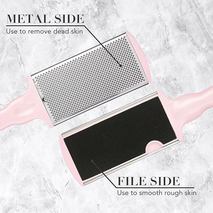 - Two-Sided Foot Grater Design - This callus remover for feet features a metal side and a file side for versatile use; the file side acts as a foot scrubber, exfoliating dead skin, while the metal side acts as a callus shaver for feet