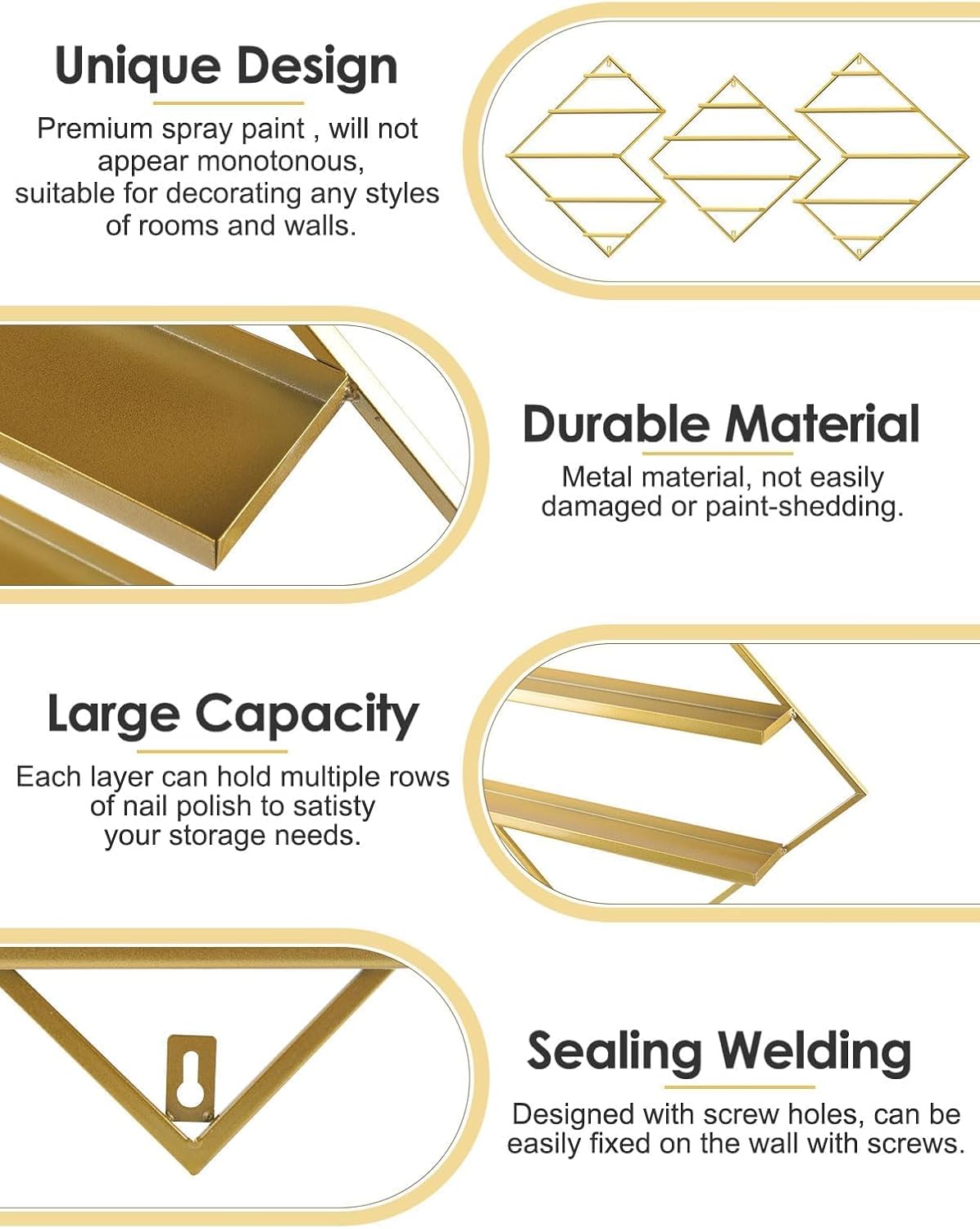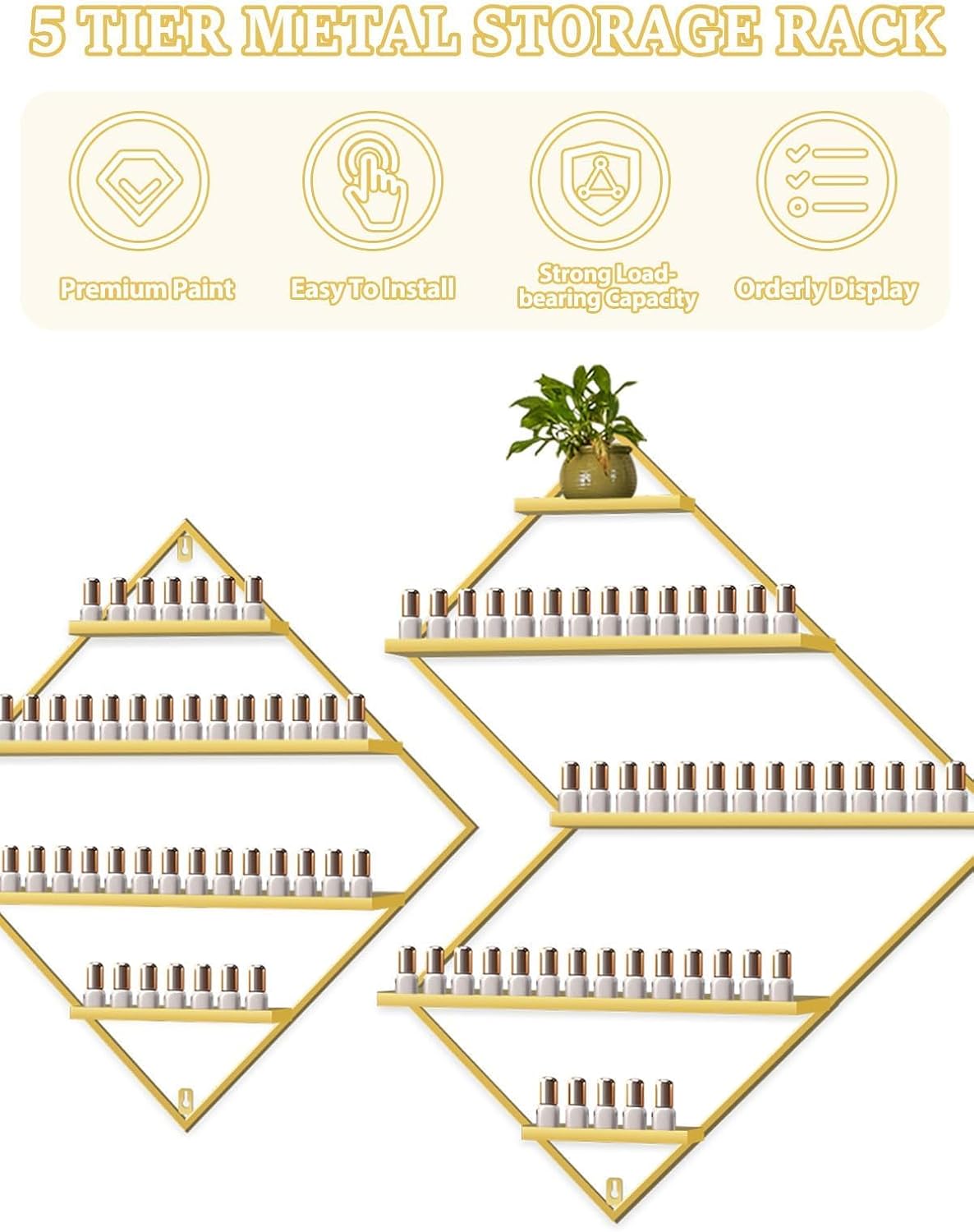 - 💅【Premium Golden Display Rack】: EBANKU metal cosmetic display racks include 2 irregular rhomboid racks and 1 rhomboid rack, which make your nail polish neatly displayed and clearly visible so that you can find the style you want quickly.