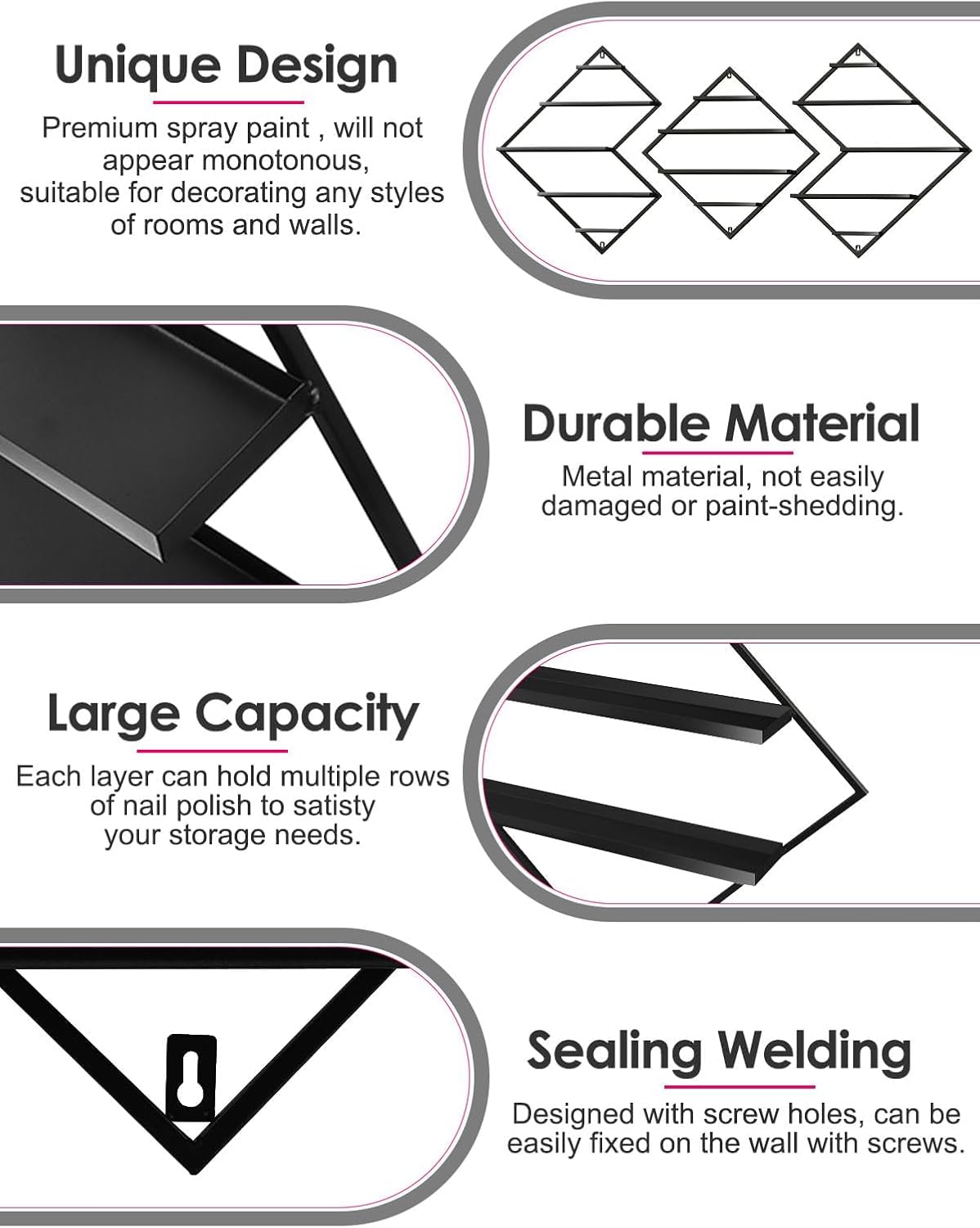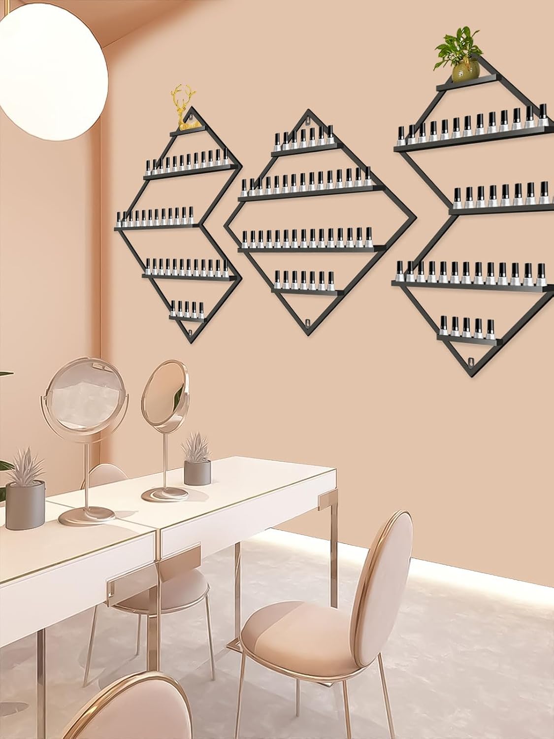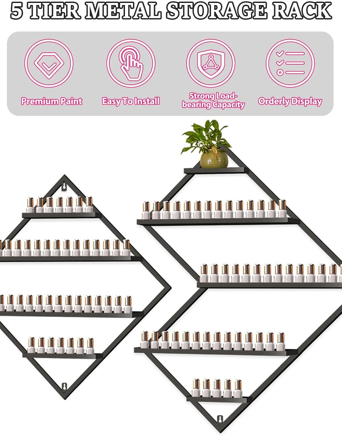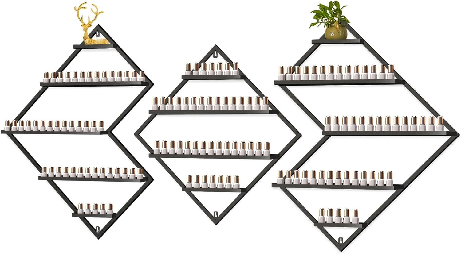- 💅【Premium Display Rack】: EBANKU metal cosmetic display racks include 2 irregular rhomboid racks and 1 rhomboid rack, which make your nail polish neatly displayed and clearly visible so that you can find the style you want quickly.