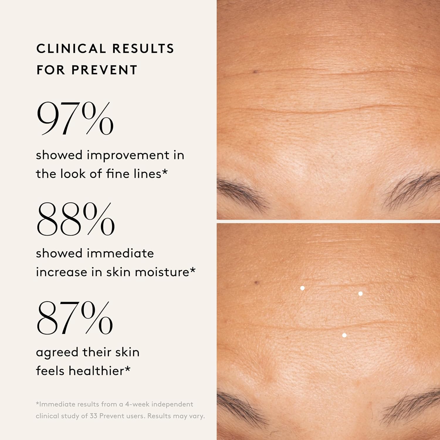 - CLINICAL RESULTS: In an Independent Clinical Study, 97% of Prevent users showed an improvement in the appearance of fine lines and wrinkles, and 88% showed an immediate increase in skin moisture.*